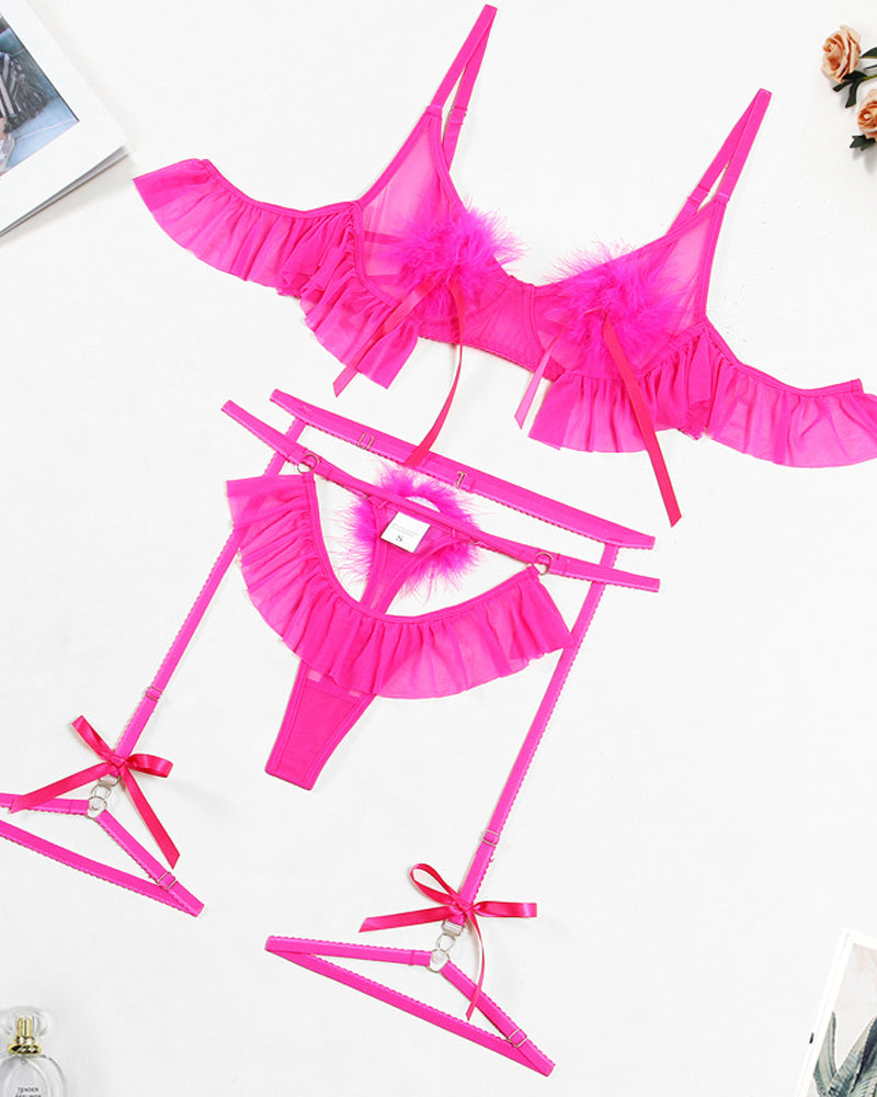 Plush Ball Pleated Skirt See-through Mesh Sexy Underwear Set