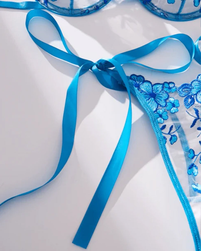 Sexy Flower Embroidered Mesh Lace Gathered Bra Set